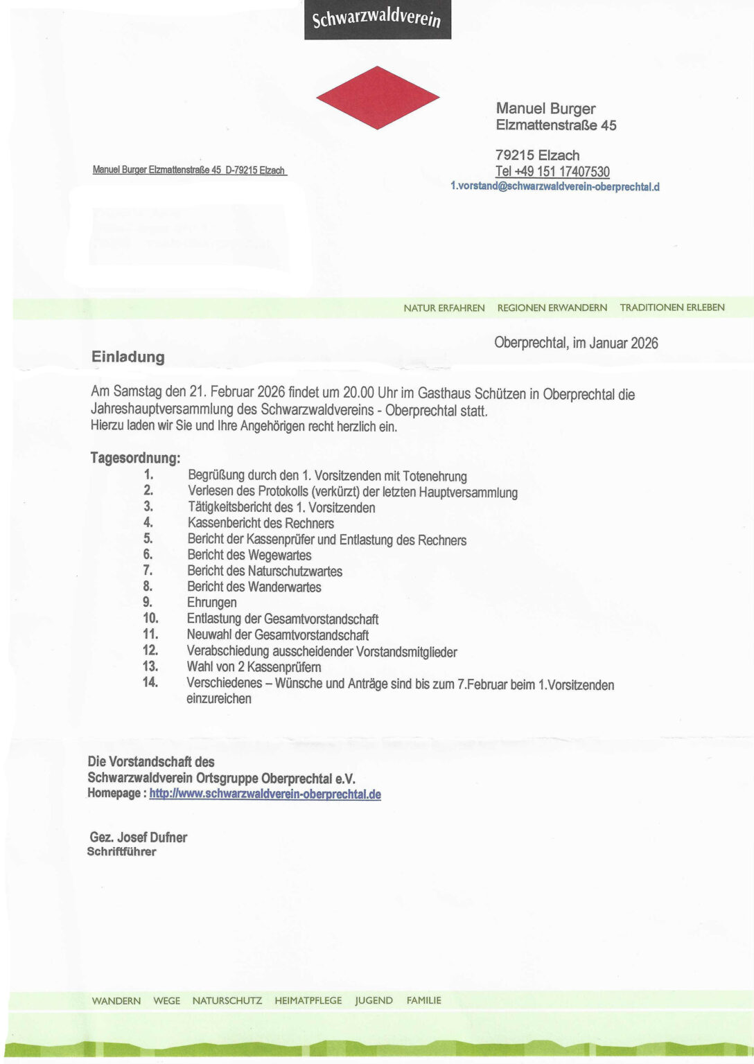 Am Samstag, 21. Februar 2026 findet um 20.00 Uhr im Gasthaus Schützen in Oberprechtal unsere Jahreshauptversammlung statt.